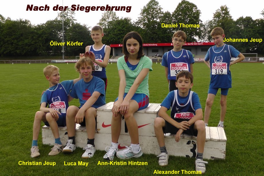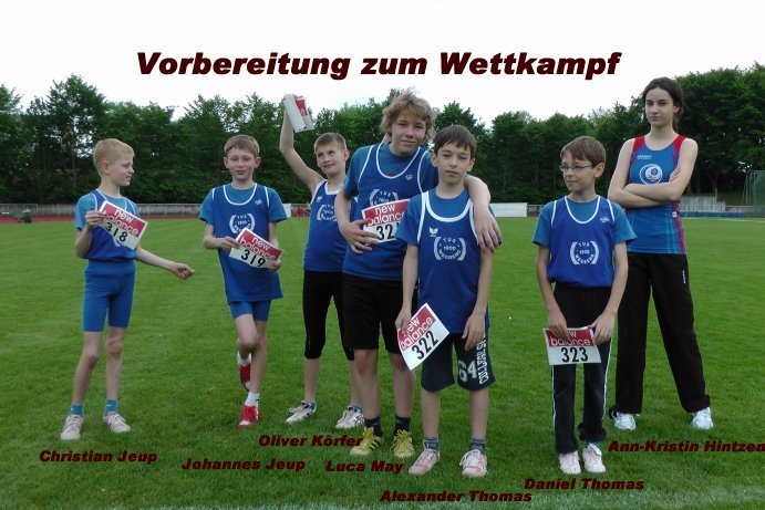 Ergebnisse von den NRW-Mehrkampfmeisterschaften in der Leichtathletik am 23. Juni 2012 in Paderborn: Die Gymnasiastin Ann-Kristin Hintzen (W13) schaffte locker die Qualifikation im Fünfkampf mit den Leistungen: 75 m 10,73 sek., Weitsprung 4,70 m, 3kg Kugel 7,29 m (persönliche Bestleistung) Schleuderball 26,38 m, 1000 m 4:14,0 Min. Ann-Kristin sammelte 42,77 Punkte und wurde 4. Im Schleuderballwurf - Einzel belegte sie mit 27,90 m den 2. Platz Auch Luka May (M13) darf nach Einbeck fahren. Lucas Leistung im Fünfkampf: 75 m - 11,08sek. - Weitsprung 4,24 m - 3kg Kugel 8,39 m pB Schleuderball 30,01 m - 1000 m 3:41,7 Min. Im Schleuderball -Einzel konnte Luca auch hier die Quali mit 33,30 m holen. Robin Schmiedicke (U18) schaffte im Fünfkampf als viert - Platzierter . 100 m 12,26 sek. - Weitsprung 5,53 m - 5kg Kugel 10,55 m - Schleuderball 52,55 m - 1000 m 3:29,1 Min. und im Schleuderball -Einzel als Zweiter mit 54,18 m die Qualifikationen. Mit 23,55 m im Schleuderballwurf belegte Alexander Thomas (M12) den 3. Platz und im Fünfkampf: 75 m 12,17 sek - Weitsprung 3,64 m - Kugel 5,50 m - Schleuderball 21,08 m - 1000 m 4:08,9 Min einen 9. Platz. Er hat leider die Fahrkarte nach Einbeck verpasst. NRW-Meister wurde David Schmiedicke (M13) im Schleuderballwurf mit 38,85 m und sicherte sich mit dieser Weite die Fahrkarte nach Einbeck. Ebenfalls NRW-Meister im Dreikampf wurde Johannes Jeup (M11). 50 m 8,65 sek - Weitsprung 3,70 m - 2kg Kugel 5,50 m. Dieser Wettkampf endete auf Landesebene. Er kann somit nicht nach Einbeck fahren. |