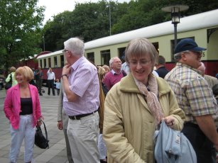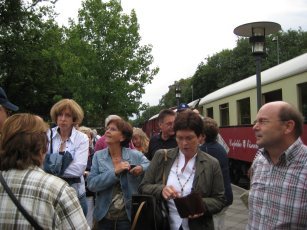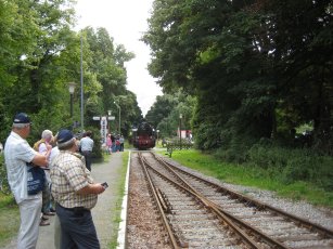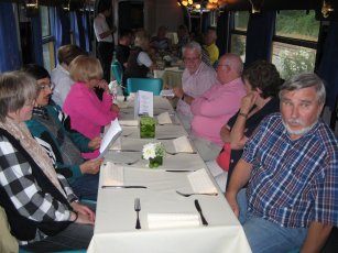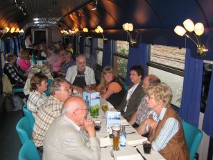 Am Nordbahnhof fuhr der Zug um 18.35 Uhr ein und wir gingen schnurstracks auf die zwei blauen Salonwagen zu, in denen für uns eingedeckt war und wir zu Abend aßen. Nach diesem langen Tag schmeckte es ausgezeichnet und wir ließen, wie es sich gehört, nichts in den Töpfen übrig. Gegen 21.10 Uhr wurde bezahlt und wir fuhren wieder nach Wegberg zurück, wo wir gegen 22.00 Uhr eintrafen. |