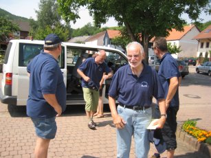 Mit 2 Großraumtaxis geht die Fahrt in den bekannten (Nachbar) Weinort Ayl. Dort will auch Günter zu uns stoßen, um wenigstens die Weinprobe mitzumachen. Aber welcher Schreck für alle, als wir dort eintreffen: Günter hat bei heißem Wetter auf der Fahrt einen Schwächeanfall / Kreislaufkollaps erlitten und muss mit dem Notarztwagen nach Trier in`s Krankenhaus gebracht werden. Wie sich im Nachhinein herausstellt, eine gute Maßnahme, denn dort kann ihm fachgerecht geholfen werden. Dieses Erlebnis drückt doch anfangs erheblich auf die Stimmung, die sich aber nach einigen Weinproben merklich bessert. |